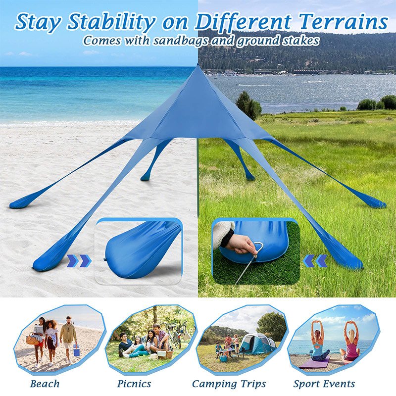 6 sandbags and 6 ground stakes keep it stay stability on different terrains.