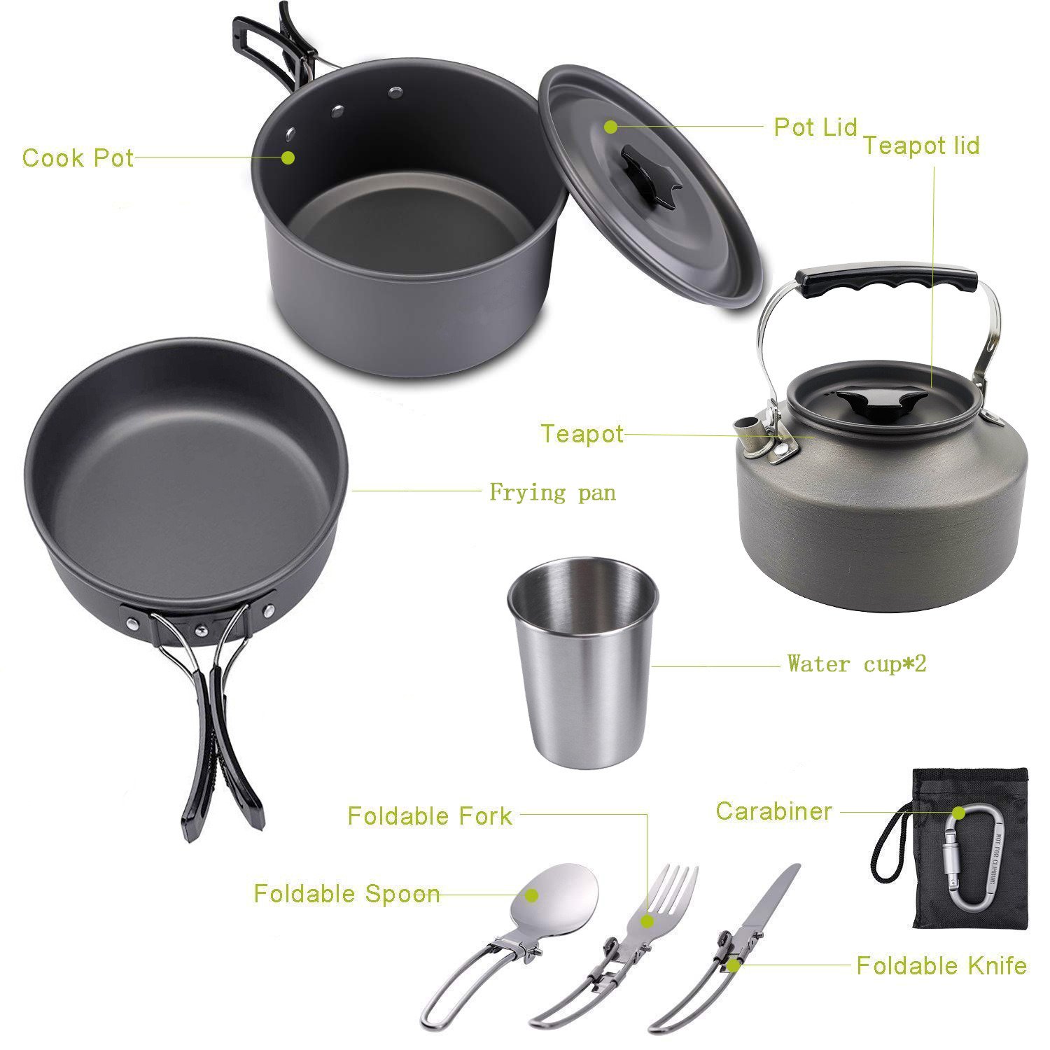 Suitable for 2-3 people; including a large pot; a frying pan; a teapot; two 304 stainless steel cups; a fork; a spoon; a knife; a lock; the pot set is made of aluminum alloy; which has been treated with high-grade hard. High temperature and friction resistance. Knives; forks and spoons are made of 410 stainless steel. Selected 304 stainless steel water cup; specially customized; can be put into the teapot; easy to carry.