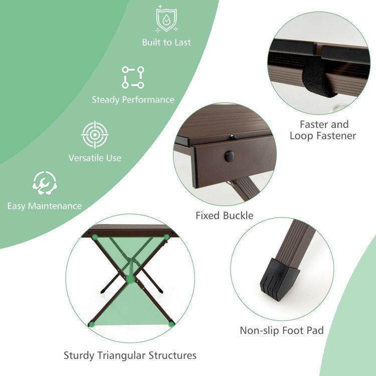 ● Steady Performance: This roll-up table is designed with sturdy triangular structures and a reinforced crossbar that will stand firm to hold up to 176 lbs. Besides, the large tabletop accommodates 6 people at once. During use, the faster and loop fasteners, as well as the fixed buckles prevent the tabletop from falling.