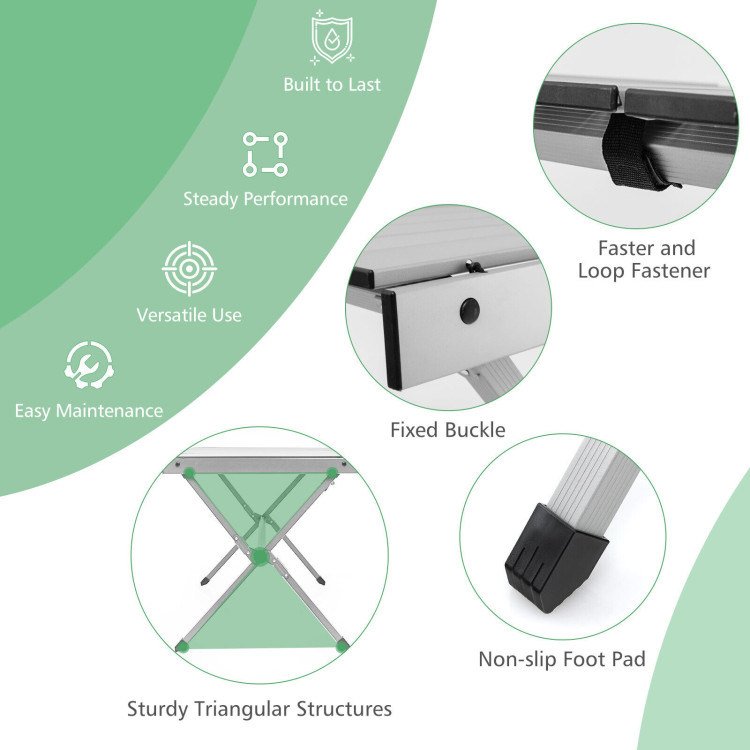 ● Steady Performance: This roll-up table is designed with sturdy triangular structures and a reinforced crossbar that will stand firm to hold up to 176 lbs. Besides, the large tabletop accommodates 6 people at once. During use, the faster and loop fasteners, as well as the fixed buckles prevent the tabletop from falling.