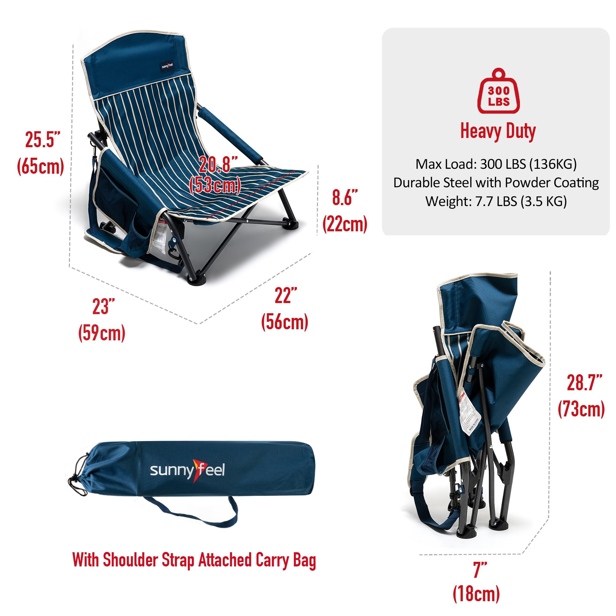 Extremely Comfy & Space Saving: The low seat beach chair seat & anti-sink leg cap & armrest design provide you an ultimate soft seating experience.The breathable and cooling mesh back design makes sitting for long comfortable for you. The small folding size (29×7.5×7 inches) saves your room while not on duty.