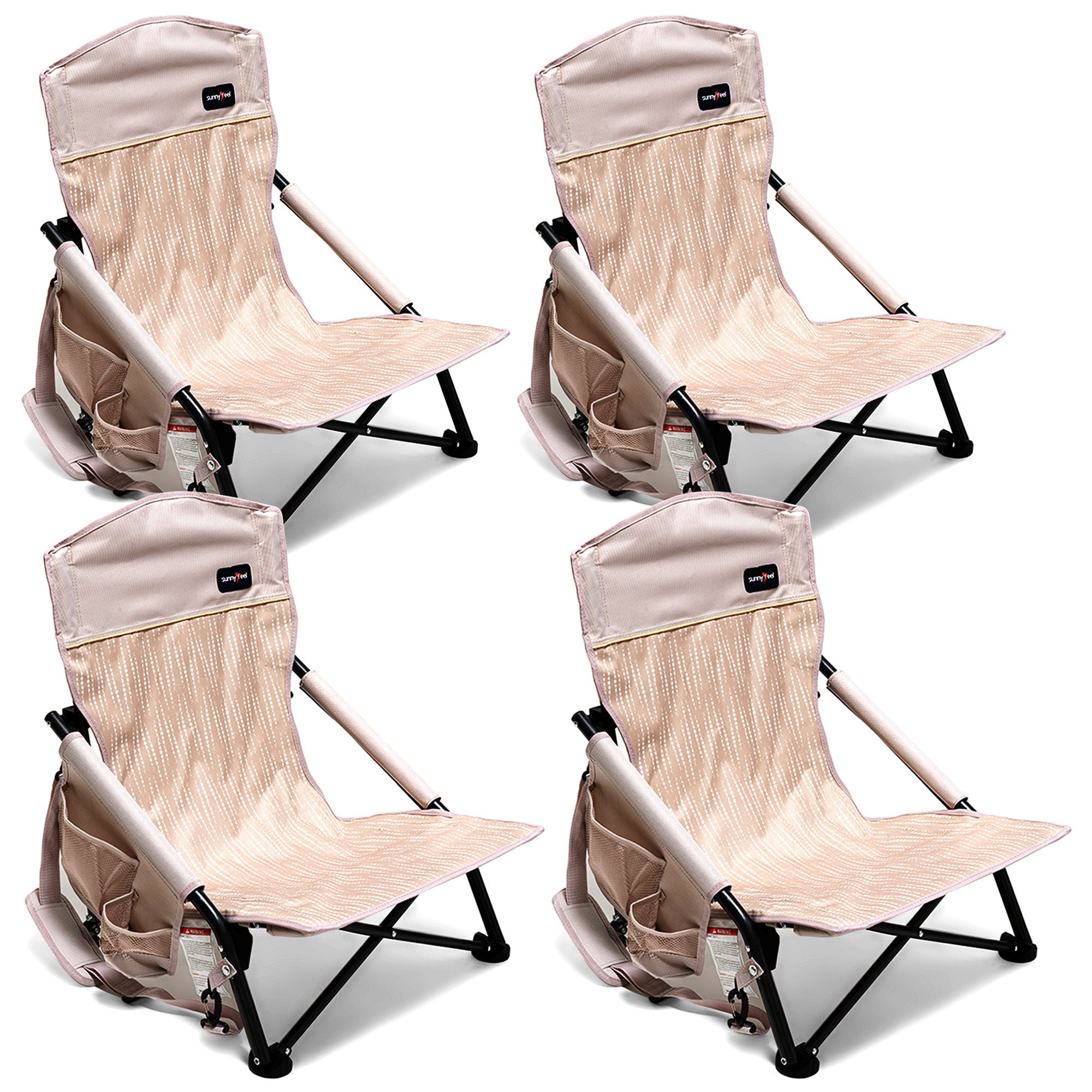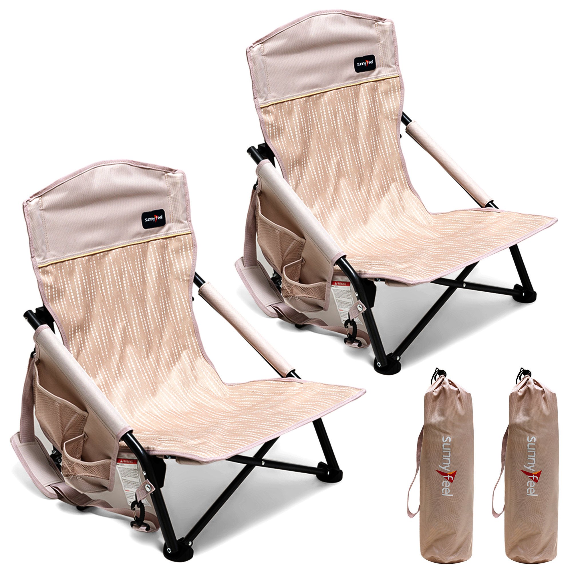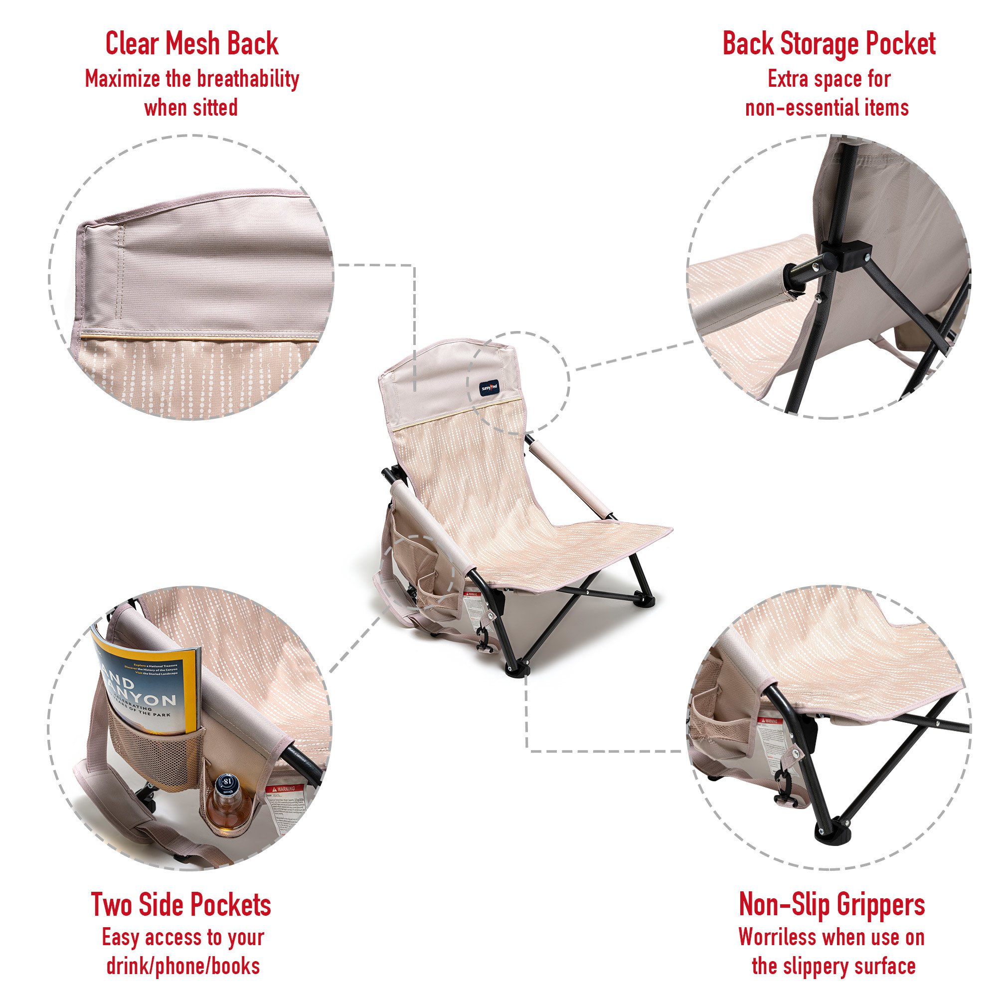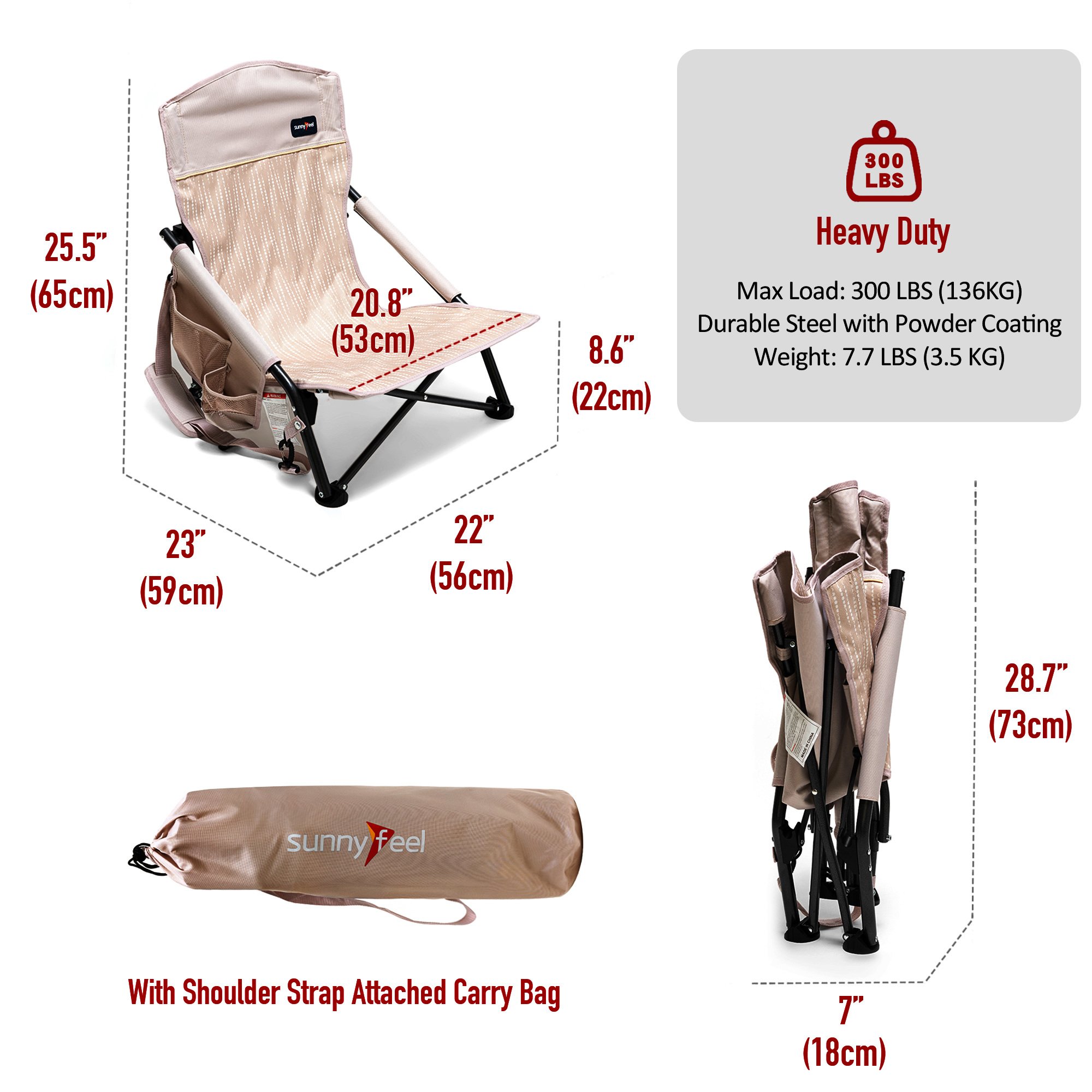 Extremely Comfy & Space Saving: The low seat beach chair seat & anti-sink leg cap & armrest design provide you an ultimate soft seating experience.The breathable and cooling mesh back design makes sitting for long comfortable for you. The small folding size (29×7.5×7 inches) saves your room while not on duty.