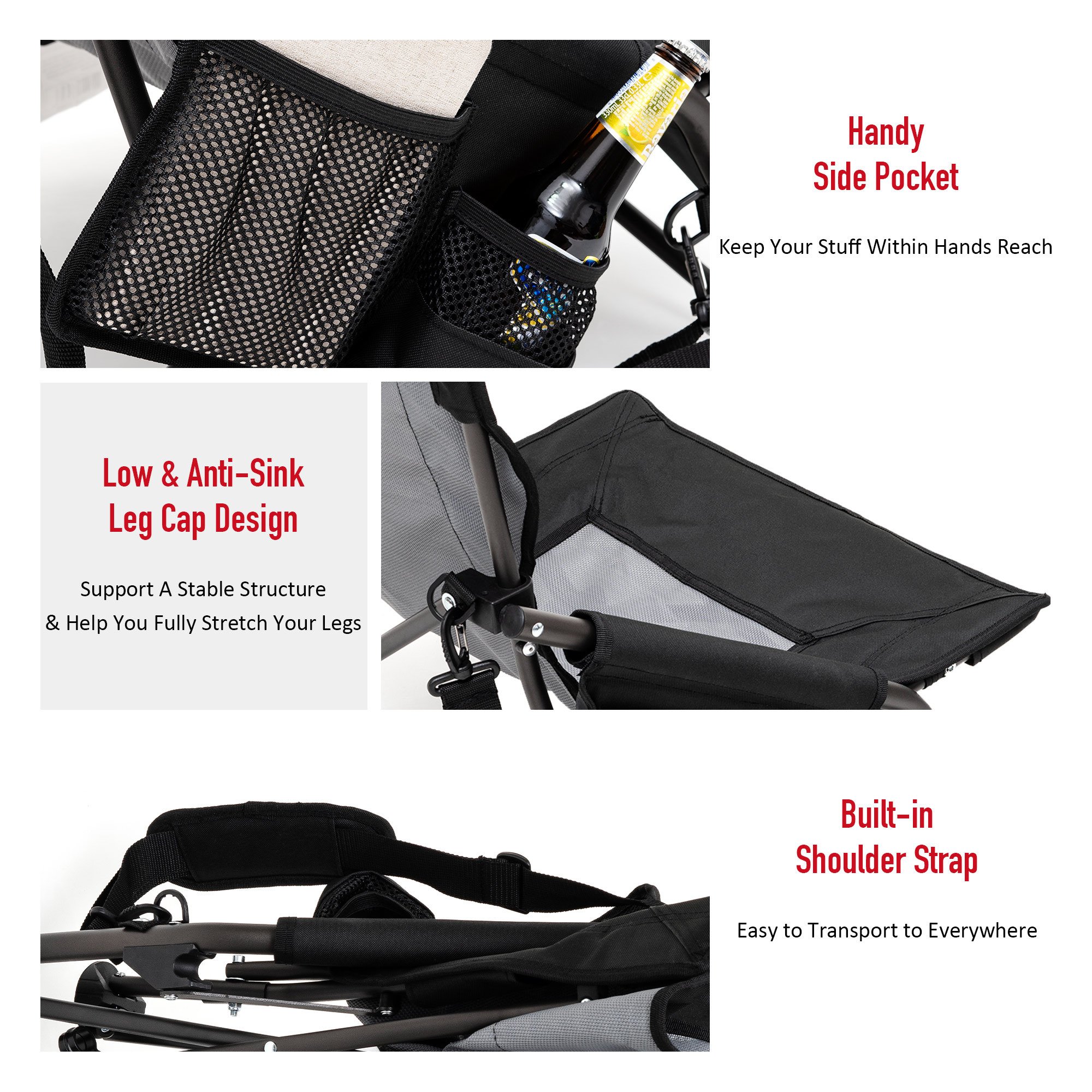 Extremely Comfy & Space Saving: The low seat beach chair seat & anti-sink leg cap & armrest design provide you an ultimate soft seating experience.The breathable and cooling mesh back design makes sitting for long comfortable for you. The small folding size (29×7.5×7 inches) saves your room while not on duty.
