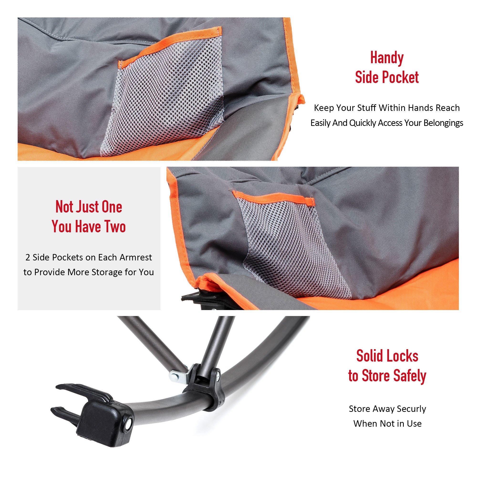 Super Handy: The portable rocker camp chair has a built-in side pockets on each armrest free your hands while camping, hiking, traveling or watching sporting events, and easily store your sunglasses, books, and phone within hands reach. The solid locks keep the chair folded tightly, and help you to store away safely when not in use